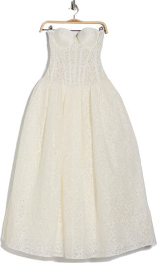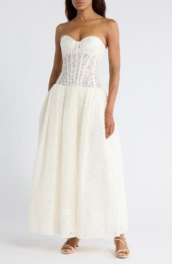 Turn heads in this romantic strapless maxi dress balancing a sheer, bustier-inspired lace bodice with a full A-line skirt.