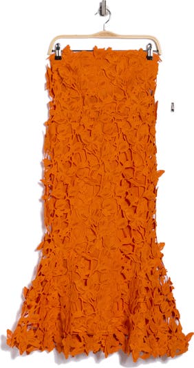 Dimensional butterflies bring whimsical charm to this strapless guipure lace midi dress framed by a fluttery flounced hem.