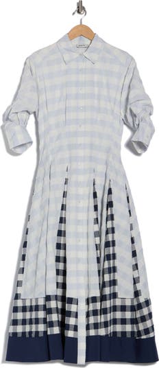 Mixed check prints bring contemporary charm to this crisp cotton shirtdress fashioned with gathered sleeves and a nipped-in waist.