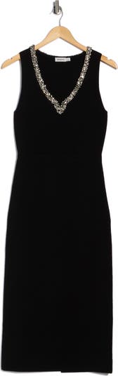 Step into the spotlight in this show-stopping midi dress fashioned in a sleeveless, figure-skimming silhouette and framed by an embellished V-neckline.