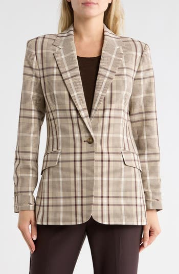A darted waist enhances the tailored appearance of this classy plaid blazer framed by notched lapels and cuffed sleeves for polished style.