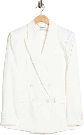 A double-breasted closure details this crisp white jacket that works for desk days and drinks dates.
