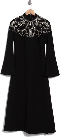 An intricate crystal design and flowy bell sleeves enhance the romantic allure of this midi dress that ensures a memorable entrance to every party.