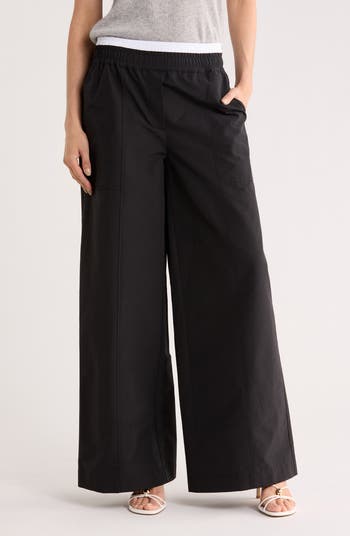 Kick it for the weekend in these lightweight cotton-blend pants fashioned with a sporty stacked waistband and a bold wide-leg silhouette.