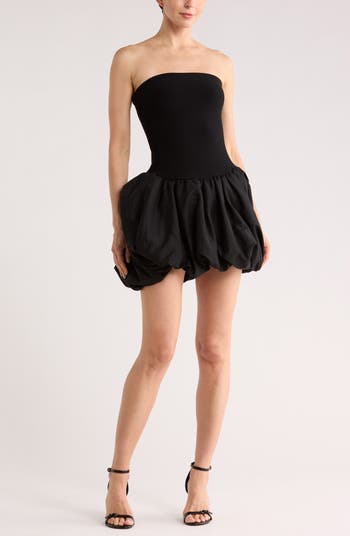 Turn heads in this party-ready minidress fashioned with a fitted, strapless bodice above a billowy bubble-hem skirt.