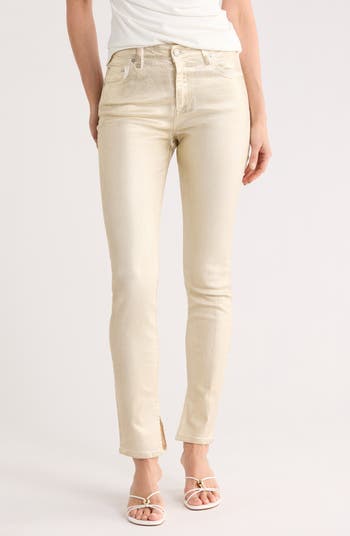 Take a shine to these metallic high-waist jeans cut from sturdy stretch denim in a chic ankle-length skinny-leg silhouette.
