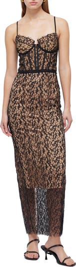 Lovely lace romances this night-out dress designed with a bustier bodice and slender adjustable straps.