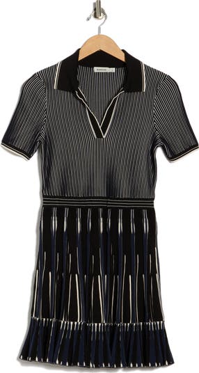 Feel country-club-chic in this sporty leggy-length dress knit with variegated stripes and styled with a tiered circle skirt.