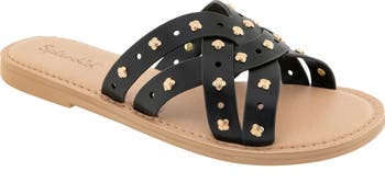 Crisscrossing faux-leather straps secure your foot in a summery sandal adorned with polished, studded hardware to illuminate each stride.