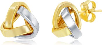 Two-tone gold creates twisted bands that shape a classic love knot stud earring with minimalistic stylelines.