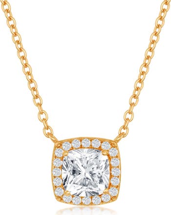 A princess-cut CZ halo pendant brings glamour to this 14K yellow gold plated sterling silver necklace.