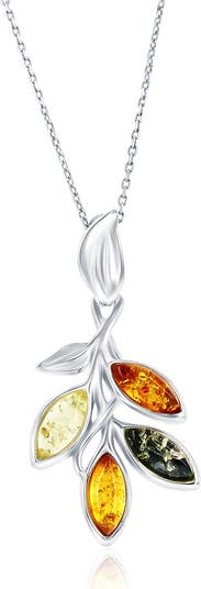 Multicolored amber adds vibrant sparkle to this leaf-shaped pendant necklace crafted in Poland from polished sterling silver.