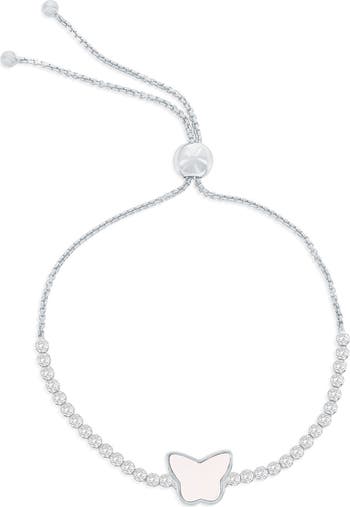 A slide closure offers easy adjustments of a chain bracelet centered by a mother-of-pearl charm flanked by a row of cubic zirconia.