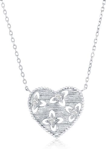 Round cubic zirconia framed by airy cutouts bring romantic sparkle to a textured heart pendant necklace crafted from polished sterling silver.