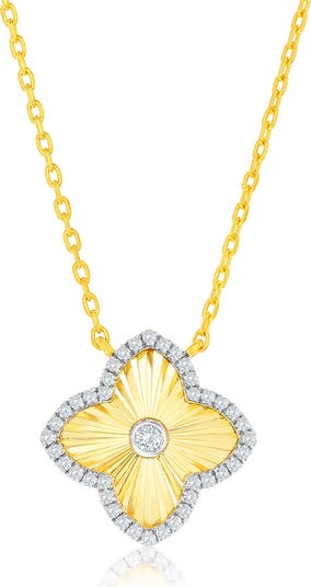 A textured finish catches the light on a two-tone quatrefoil pendant necklace framed in sparkling cubic zirconia.