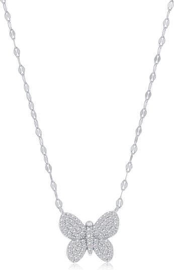 Pavé cubic zirconia stones lend sparkle and shine to this butterfly pendant that's suspended off a mirror-chain necklace.