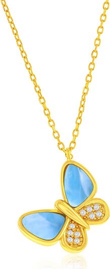 Show off whimsical shine with this dainty butterfly pendant necklace enriched by larimar stones and sparkly cubic zirconia.