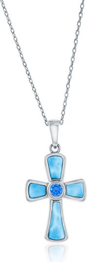 A delicate chain necklace shaped from sterling silver is centered by a cross-shaped pendant defined by larimar stones and a cubic zirconia.