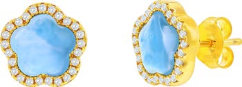 Show off a pretty pop of color with these larimar flower stud earrings framed by sparkly cubic zirconia halos.