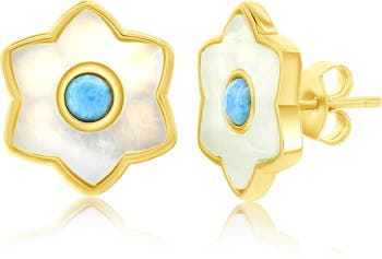 Round-cut larimar and mother-of-pearl center these flower-shaped studs that bring a dose of sweetness to your date-night attire.