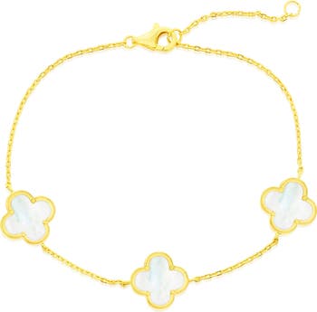 This chain bracelet features mother of pearl clover stations and is finished with a secure lobster clasp closure for everyday wear.