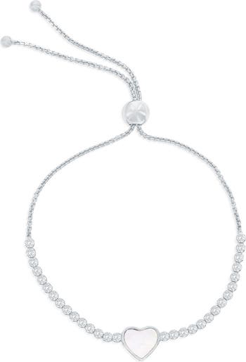 A mother-of-pearl heart brings sweet shine to this sparkly cubic zirconia slider bracelet that's perfect to stack or wear solo.