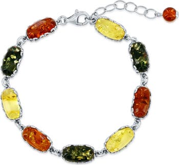 Multicolored amber adds vibrant sparkle to this oval station bracelet crafted in Poland from polished sterling silver.