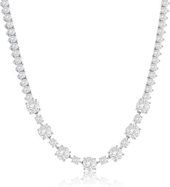 Round cubic zirconia stations bring focal sparkle to an elegant tennis necklace crafted from polished sterling silver.