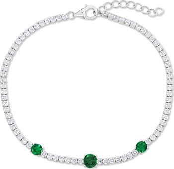 are prong-set along this timeless tennis bracelet featuring a trio of larger colorful stones.zirconiaRound-cut cubic