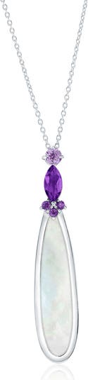 Mixed-cut amethysts sparkle above a shimmery mother-of-pearl drop on this elegant necklace crafted from polished sterling silver.