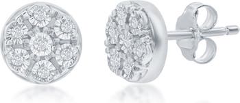 Polished sterling silver round stud earrings offer dainty sparkle with a cluster of bright-cut diamonds.