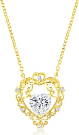 Sterling silver filigree details shape an open heart pendant necklace that shines with cubic zirconia details.