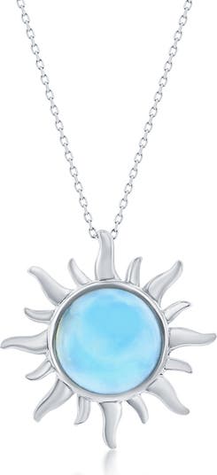 A round-cut larimar stone accents the whimsical sunray pendant of this sterling silver necklace.