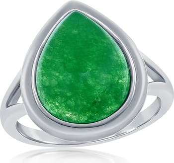 A pear-shaped jade stone adorns the center of an elegant ring shaped from sterling silver.