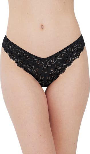 Eyelet lace sweetens the style of a cheeky bikini made with a low-rise waist and high-cut legs that create a chic, elongated effect.