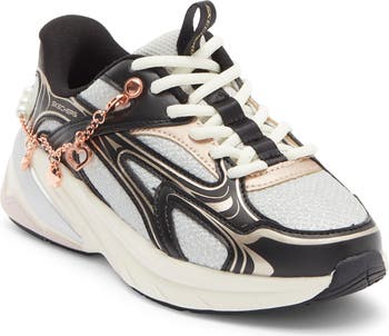A combination of faux leather and breathable knit panels define a low-profile sneaker complete with chain hardware sure to delight your fashion-forward kiddo.