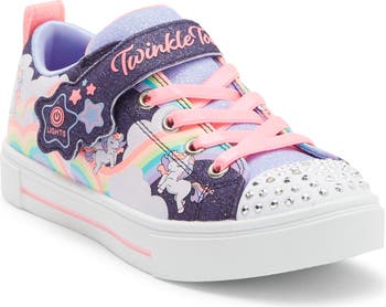 Your kiddo will love galloping about in this glitter-splosion of a sneaker aflutter with rainbows, unicorns and twinkling light-up sequins on the toe.