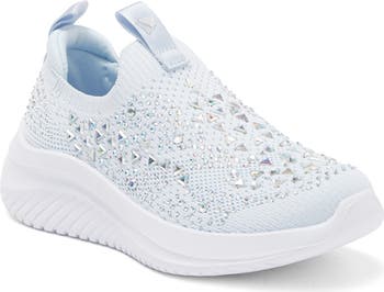A crystal-embellished knit upper kicks up the style factor of an easy-on sneaker set on a flexible sole to keep up with your on-the-go kiddo.