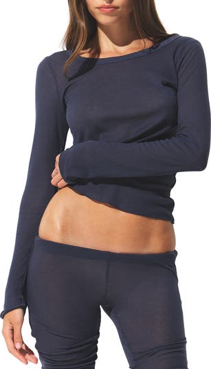 Lightweight and soft in sheer ribbed fabric, this long-sleeve top features a wide jersey neckline and a relaxed fit. It's finished with contrast stitching at the hem and sleeves, and it fits true to size.