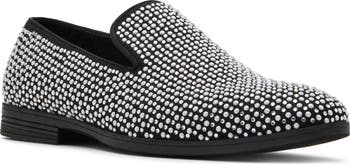 Flashy flat studs cover a sleek loafer, infusing a menswear classic with a little extra dazzle.