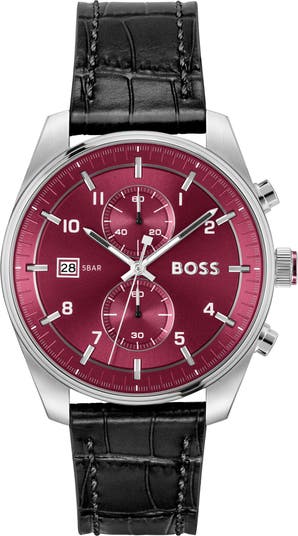 Dual subdials and a streamlined silhouette enrich a sophisticated chronograph watch housed on a croc-embossed leather strap.
