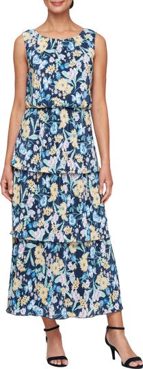 Crisp accordion pleats add texture to this sleeveless maxi dress fashioned in a tiered silhouette.