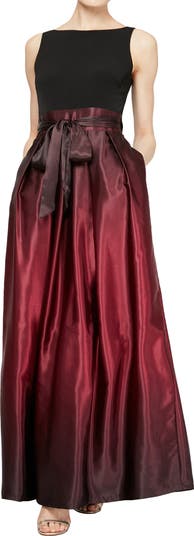 This special-occasion gown features a classy boatneck, waist ties, hidden pockets, and a full skirt. Lovely ombre print satin elevates your look with instant elegance.