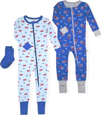 Bedtime gets a fun boost with this set of cozy coverall pajamas featuring a whimsy pattern and paired with grippy crew socks.