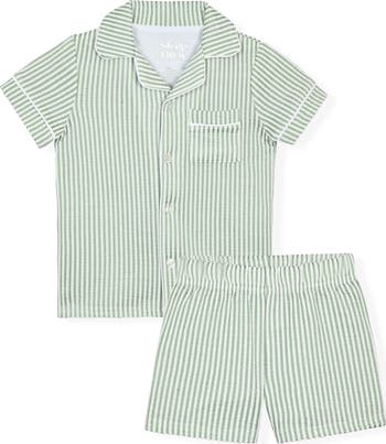 They'll doze off into dreamland in these two-piece short pajamas featuring vertical stripes and contrast piping.