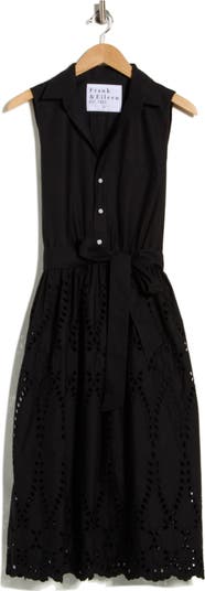 Airy embroidered eyelets grace the skirt of this sleeveless cotton dress cinched with a removable tie belt.