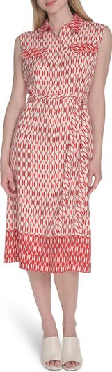 A geometric print brightens this sleeveless shirtdress fashioned in a graceful A-line silhouette accented by a removable tie belt.