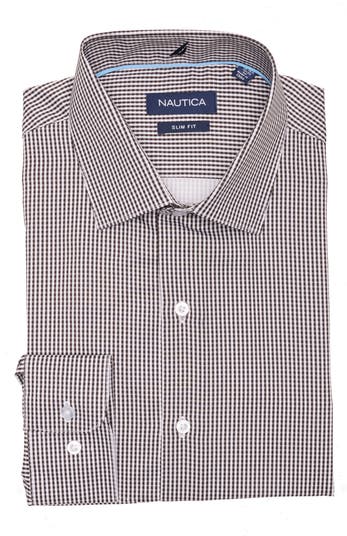 Showcase polished style in this slim‑fit dress shirt, crafted from comfortable stretch fabric and finished with a timeless check pattern.