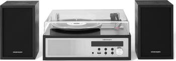 Includes: Turntable. Matching external full-range stereo speakers. Clear dust cover.