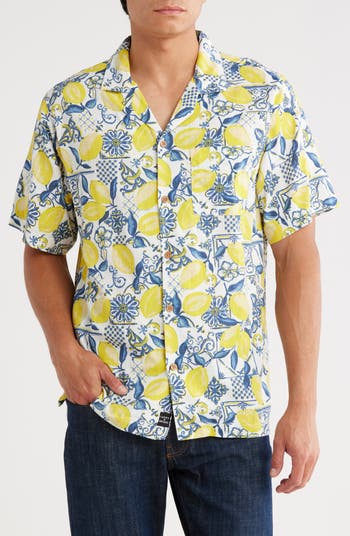 A vacation-inspired print brings a laid-back vibe to this relaxed camp shirt cut from a soft cotton blend.